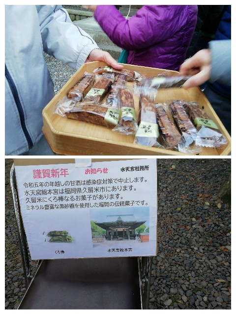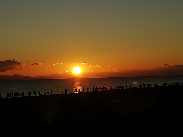 2023-01-01 2023謹賀新年 日々のくらし 日の出待ってるところ。 2023 新春 雲から抜き出て。 まるまると抜き出てきた初日の出。時間を見たらジャスト7時だった。 近くの海岸まで歩いて。 帰りは水天宮さんで初詣。 何時もの甘酒ではなく、今年は総本宮のある久留米市の銘菓くろ棒が振舞われた。 風が無いせいか大漁旗がなびいていない。静かな穏やかなお正月。 明けましておめでとうございます。 あかるくおだやかに 皆様の心がいつも平和でありますように。